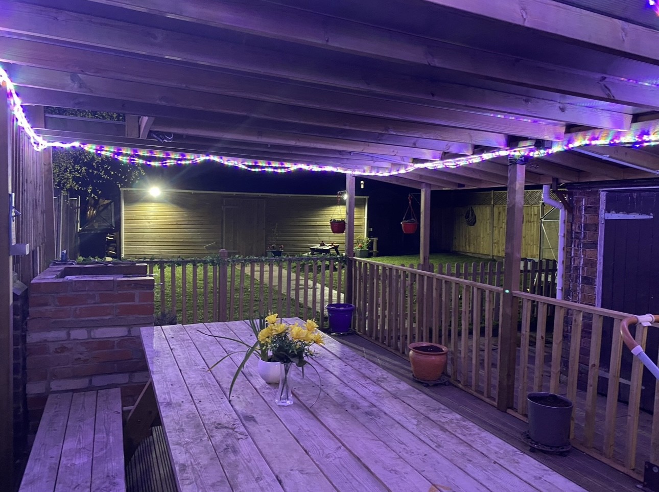 Grass area , decked area, concrete area and a greenhouse.