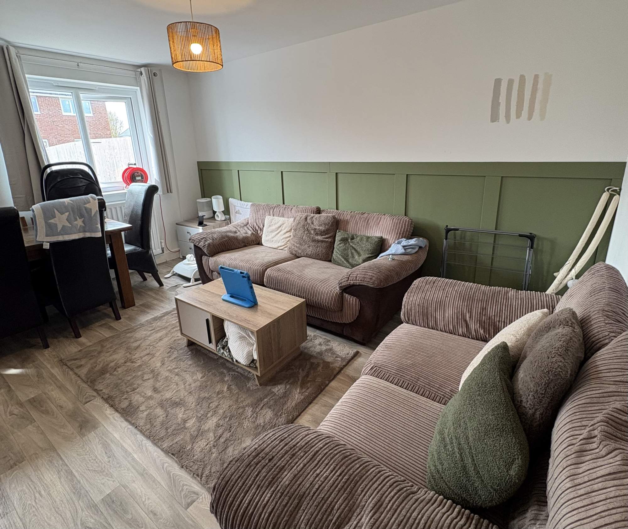 Large 2 bed new build, both large double bedrooms. Decent sized garden due to be re-turfed. Upstairs bathroom& downstairs toilet. Large living room and decent sized kitchen.